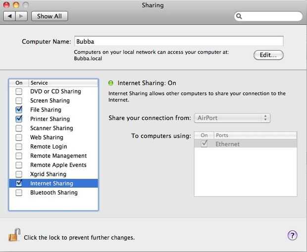 A continuación, hacer clic en la casilla de verificación para el servicio de "Compartir Internet". Ya que utilizar Airport para conectarse a internet, estoy compartiendo mi conexión desde el aeropuerto a equipos mediante Ethernet. Una vez que estas selecciones, un cuadro de diálogo pequeño pop-up y le preguntará si quiere "empezar" a compartir internet. Haga clic en "Inicio".