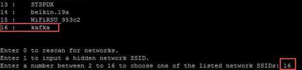 5. Seleccione la red que desea conectarse, escriba el número correspondiente de la lista y presiona Enter. Para confirmar tu inscripción, escribe Y y presiona Enter. En este ejemplo, para conectar a la red de kafka , escriba 16.