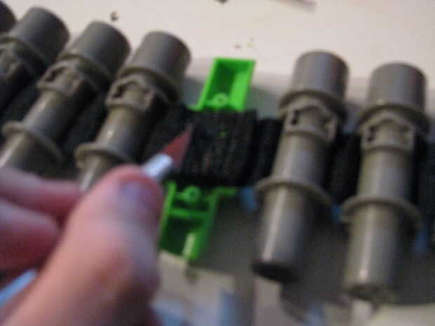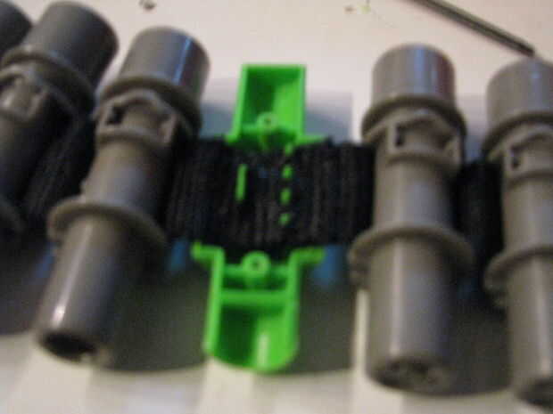 Puesto que los picos son suficientemente pequeños, simplemente presione la correa negra en el pedazo de extremo para la espiga a través de él.