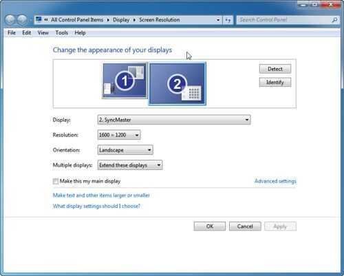 b) se verá un gran "1", que representa el ordenador y un gran "2" en la pantalla que representa la pantalla secundaria. Mueva el "2" a la derecha, izquierda, o sobre "1" y aplique de golpe. El cuadro le mostrará dónde está orientado el monitor secundario. Por ejemplo, si el "2" está a la derecha de la "1", al mover el ratón fuera de la pantalla a la derecha aparecerán en la segunda pantalla.