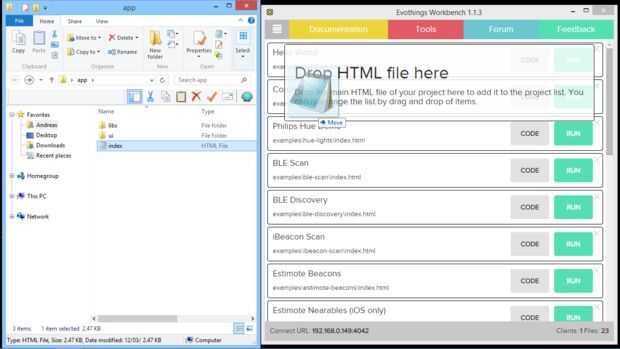 Siguiente paso es extraer la aplicación móvil conectada en su computadora. Localizar el index.html y arrastrar y soltar el archivo en la ventana de ejemplos. Haga clic en el botón de ejecutar el ejemplo. Ahora la aplicación se carga directamente en su teléfono inteligente.