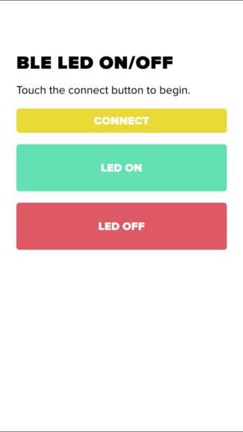 Si todo trabaja como se supone que debe tener la aplicación en la foto superior cargado en el teléfono inteligente. Cuando usted pulse el botón conectar en la aplicación que el teléfono empezará a buscar BLE permitió los dispositivos cercanos. Cuando detecta uno que se llama "ble_led" intentará conectar a eso y cambiar el estado de la aplicación. Una vez conectado, usted puede encender y apagar el LED de los botones. Empezar a jugar!