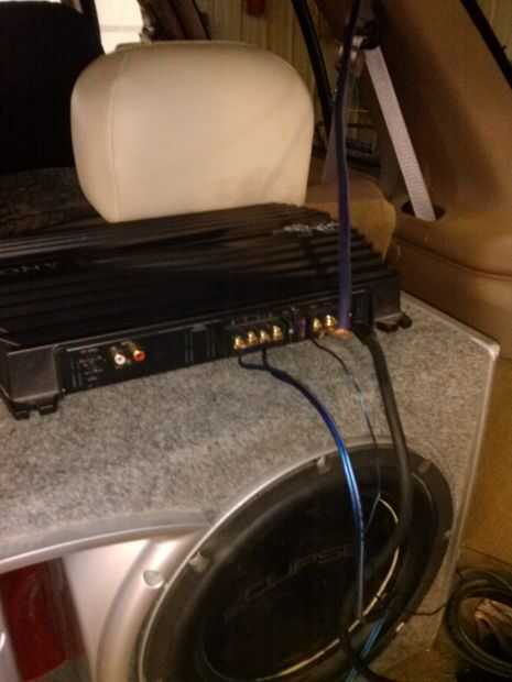 Siguiente es hora de conectar el cable del altavoz del subgrave al amplificador. En este caso los cables son de color azules. El cable azul con raya blanca es positivo y el color azul es negativo entonces conectar lógicamente!