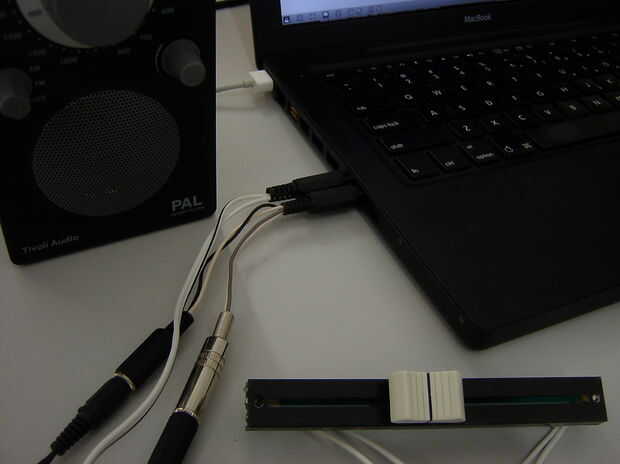 Aquí está la configuración. Usted necesita dividirá usted salida de audio con estéreo a cable mono doble. En un canal Conecte al fader y el otro, conectas un altavoz. Luego agregue un oscilador de onda senoidal y un cambiador de escala para caber al fader de frome de valor a la frecuencia del oscilador de onda senoidal en su software. Ahora, finalmente se puede controlar el oscilador de onda senoidal en 16-bits de resolución.