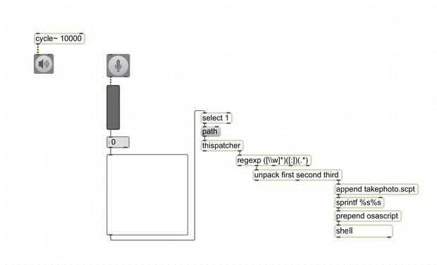 Aquí está la configuración. Usted necesitará configurar usted mismo (y sus amigos) para la foto. En su software, añadir una función de control de webcam. En este tiempo, hemos hecho un parche con MaxMSP en Mac OSX. Usamos un script de apple para controlar la cámara web y un objeto de shell para ejecutar el script.