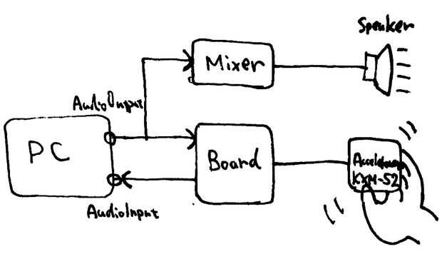 Aquí está la configuración. Usted necesita dividirá usted salida de audio con estéreo a cable mono doble. Conecte un Accerelometer (versiones KXM Kionix-52) a la Junta. Es 3 ejes pero en este tiempo utilizamos sólo un eje de la accerelometer. Uno está conectado a la energía, uno se conecta a la señal, y la última está conectada a tierra. En un canal Conecte la Junta, y el otro, conectas un altavoz. Sería bueno tener un mezclador entre la salida de audio y el altavoz para controlar por separado el volumen de la percusión.