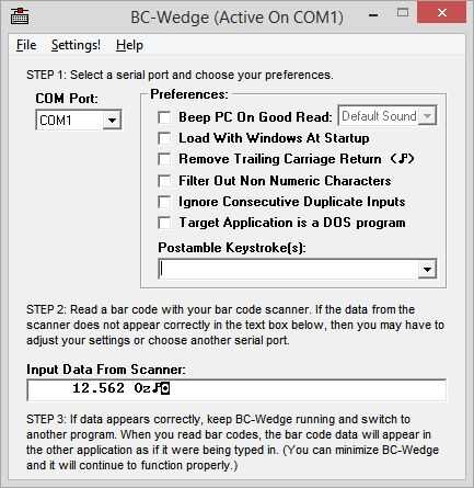 Si tiene los parámetros de comunicaciones correcto en el software BC-cuña, debe ser capaz de ver un peso de lectura en el texto de la caja etiquetada "entrada de datos de escáner" cuando usted presiona el botón de impresión en su escala. La imagen de arriba muestra datos típicos de una escala. Si no hay datos aparecen después de pulsar el botón de impresión puede tener el puerto COM incorrecto seleccionado. Si los datos aparece pero es confusa o totalmente ilegible y luego tienes el puerto COM correcto pero los parámetros de comunicación serial incorrecto seleccionado. Puede que necesite experimentar con diferentes configuraciones hasta ver datos que parece correcto. Pruebe a ajustar el número de Bits de datos en "7" y la paridad a "Incluso" e intente cada velocidad en baudios diferente hasta que vea los datos que contiene valores de peso que coinciden con lo que está en la pantalla de la balanza.