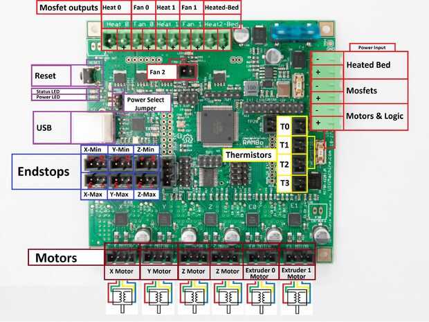 Ahora que se preparan todos los cables, conecta todo a la RAMBo será fácil y sencillo. Aquí está un resumen de todos los conectores disponibles en el RAMBo.