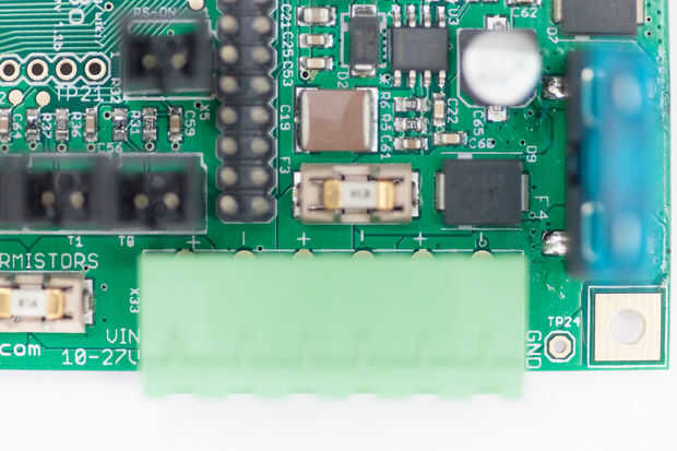 El conector es el conector de 6 pines verde (o negro) en el lado derecho del tablero con - y + polaridades marcan en el PCB (ver imagen)