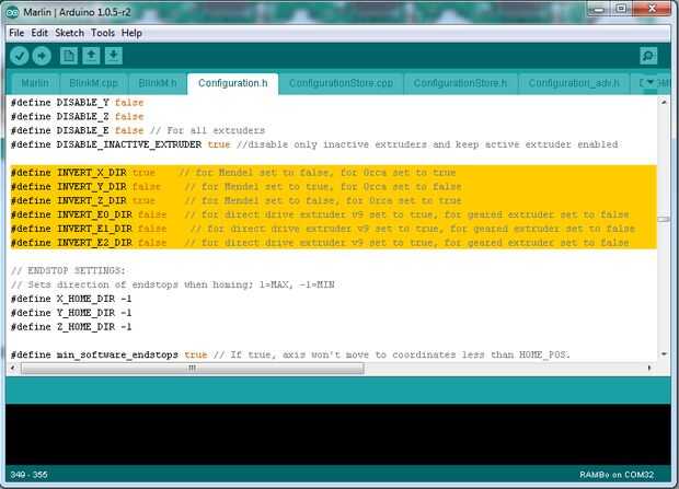 Si el motor está girando en la dirección equivocada, puede cambiar de software, cambiando el valor de la INVERT_X_DIR, INVERT_Y_DIR, INVERT_Z_DIR, INVERT_E0_DIR o INVERT_E1_DIR de falso a verdadero o de true a false, dependiendo de la dirección del motor, que está mal (ver imagen).