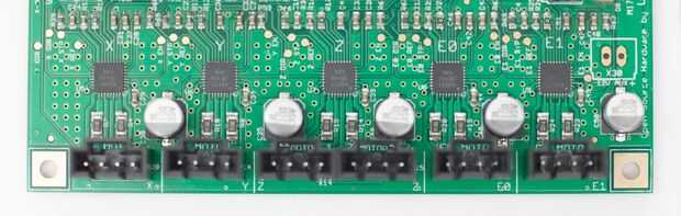 Los conectores del motor están marcados con X, Y, Z, Z, E0 y E1 para la X, Y, Z (dos veces), estirador de primera y segunda extrusora respectivamente. El motor de Z tiene un conector duplicado para conectar dos motores controlados por el mismo controlador paso a paso.