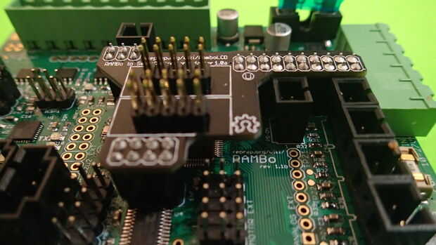 Si tienes el adaptador de LCD inteligente, ya sea como parte de su kit de accesorios o comprado por separado, usted puede fácilmente conectar el SmartLCD al RAMBo. Inserte el adaptador del LCD en el RAMBo conectando a la EXT-2 conectores ICSP 2560 y SD/SPI para que el adaptador está sentado sobre el Atmega2560 chip (ver imagen).