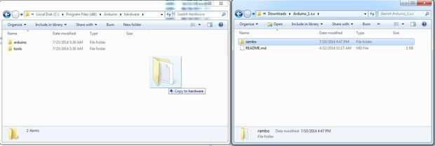 Una vez que extrae el archivo zip del Arduino Addon, encontrará en él un directorio llamado rambo, necesitará copiar dicho directorio al directorio de hardware de la instalación de Arduino.