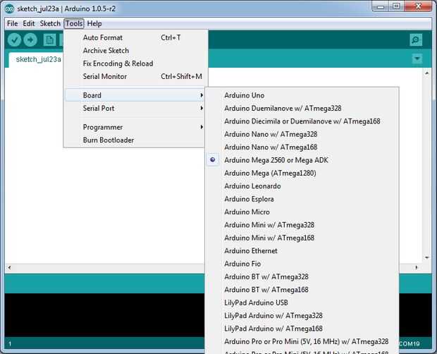 El IDE de Arduino tiene archivos de configuración para diversos productos de Arduino. Cuando se abre el IDE de Arduino, puede seleccionar el tipo de tabla que se va a utilizar. En el caso de RAMBo, seleccionando el "Arduino Mega 2560 o Mega ADK", como se ve en la imagen de arriba, a trabajar. Sin embargo, esto no permitirá que utilice características extendidas de la tabla, como la pantalla LCD.