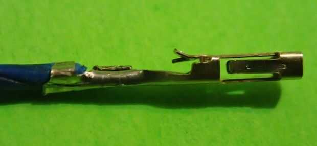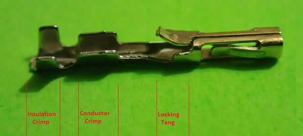 En primer lugar, tienes que separar un alfiler de engarce del paquete suministrado y revísela, debería ver dos pares de pestañas en un extremo de la varilla de la encrespadura un par un poco más grande que la otra. Las lengüetas en el extremo del perno se llaman engarzado de aislamiento y se utilizan para aliviar el estrés manteniendo el aislamiento del cable, mientras que las lengüetas más grandes se llaman engarzado del conductor y se utilizan para la fabricación del contacto con el alambre sí mismo. También habrá un bloqueo tang que mantendrá la presión en el interior de la carcasa del conector. Por favor familiarícese con el perno de presión antes de leer más (ver imagen).