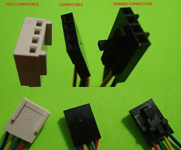 Ver la imagen de arriba para ejemplos de conectores motor stock compatibles y no compatibles con un conector de RAMBo para la comparación.