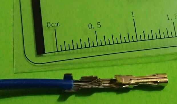 Ahora puede cortar alambre del motor justo antes del conector existente si hay uno. Utilice un pelacables para el final del aislamiento de la tira y revelan los cables de cobre debajo. Solamente debe tira unos 3mm (1/8") del extremo del alambre. Uno de los pasadores hembra crimp uso como referencia para la longitud necesaria, sabiendo que el alambre no debe ir más allá de la encrespadura del conductor del perno, y el aislamiento debe encajar en el engarzado del aislamiento (ver imagen).