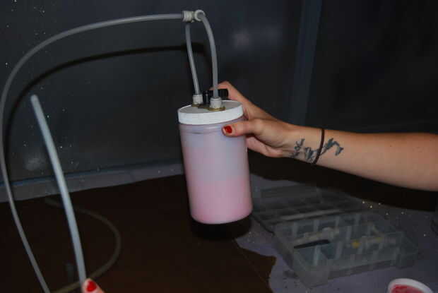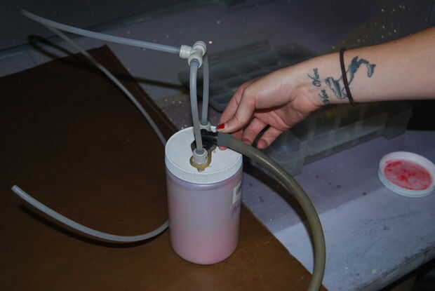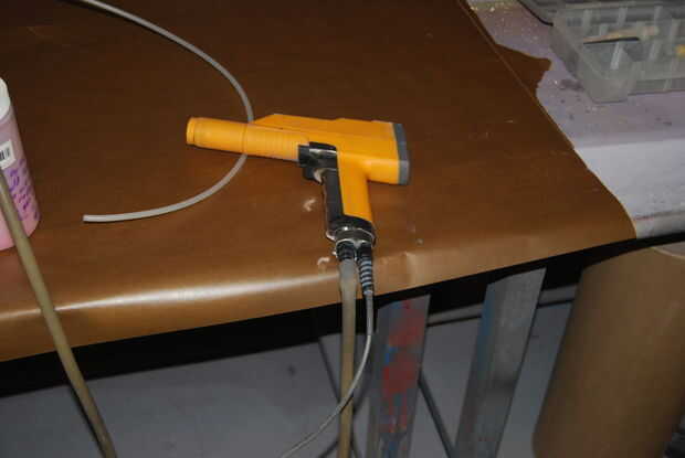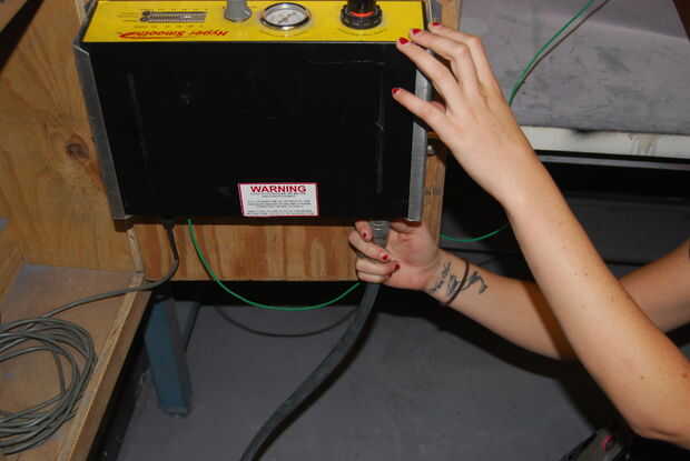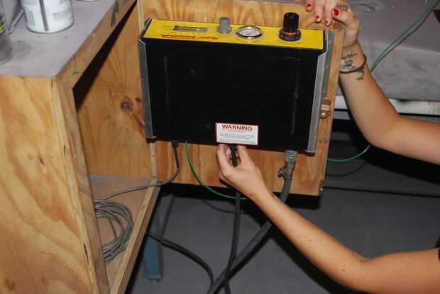 Inserte el extremo macho de la manguera de aire en el suministro de aire de tiendas. Conecte el extremo hembra en la parte inferior de la unidad de la capa de polvo.