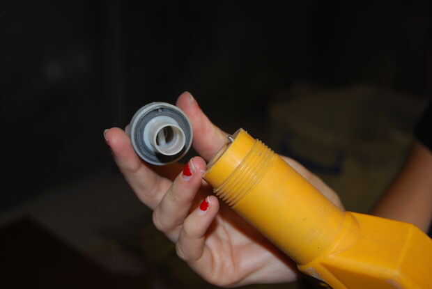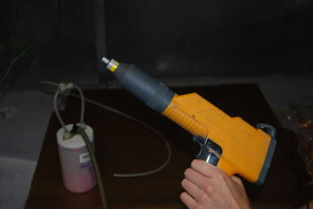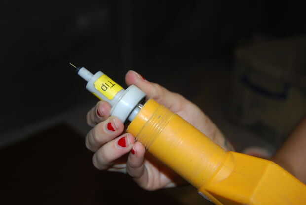 Tomar la punta estándar en el kit. Hay un agujero en la Junta en la parte inferior de la punta. Este orificio se corresponde con la aguja en la punta de la pistola. Coloque la punta de la pistola por lo que se está insertando la aguja en el orificio. Luego tomar la Copa sheilding gris del kit y enrosque en la punta de la pistola.