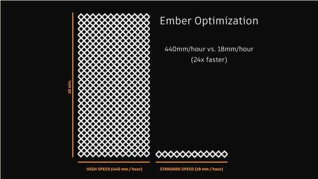 Ascua la impresora está abierta que significa que se puede utilizar fácilmente para explorar los límites de la impresión 3D DLP SLA. A través de la optimización de la configuración de la impresora, el software y el material (sin modificaciones de hardware) es posible aumentar el estándar velocidad de impresión de brasa de 18mm/hora para 440mm/hora un aumento por un factor de 24 para una particular clase de geometrías.