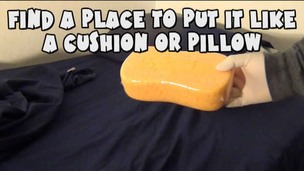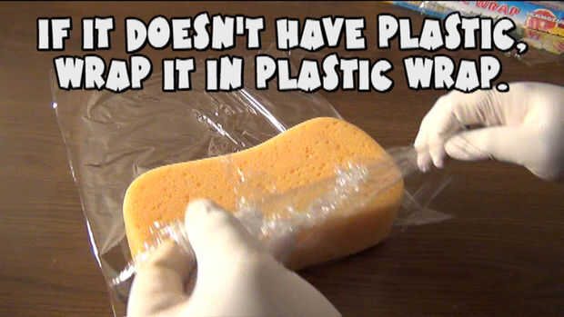 Lo primero es lo primero, prepara la esponja. Si está utilizando una nueva esponja generalmente vienen sellada en un envoltorio de plástico si no, sólo enróllelo alrededor de la película plástica regular que probablemente tienes en tu cocina.