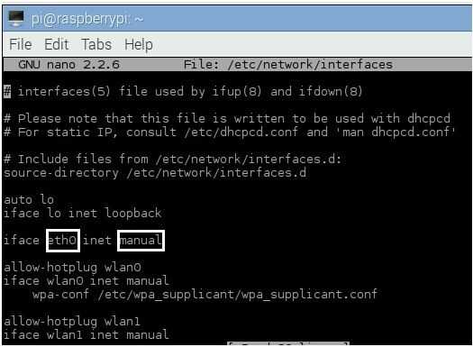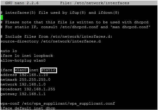 Ejecutar sudo nano/etc/network/interfaces . Esto abre el archivo de configuración para la configuración de red en el editor de texto nano. La captura de pantalla se muestra en la image1 y hacer cambios de eth0 wlan0 y manual de estática como se muestra en image2, porque estamos utilizando wireless. A continuación, agregue las siguientes líneas directamente debajo de la línea que apenas alterado.