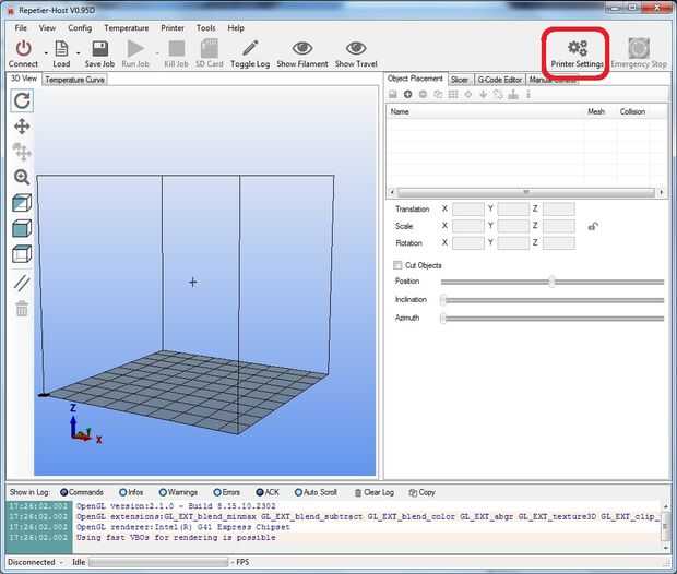 Repetier abierta y haga clic en "Configuración de impresora" en la esquina superior derecha de la ventana.
