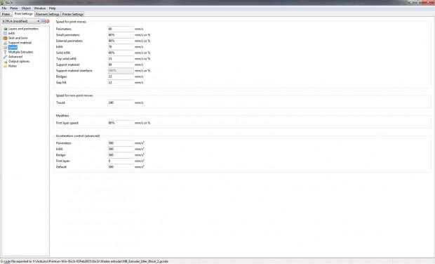 Cuando utilizando la configuración de velocidad con secind mm/s valores en lugar de porcentajes (si procede) Slic3r a veces crea código de G con escalonamiento de velocidades superiores a 7000 mm/s en lugar de alrededor de 1500 - puede consultar el código de G con un editor de texto para eso, sólo mirar hacia fuera para los números "F" al final de una línea que indica la configuración de velocidad hasta la velocidad siguiente / cambio de movimiento.