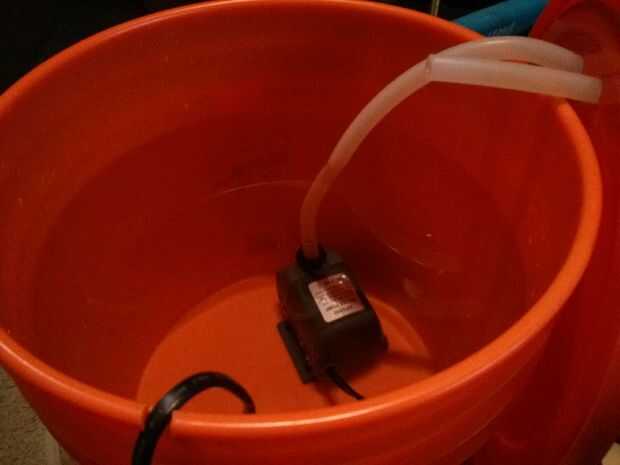 Ahora que te hemos preparado el cubo, conecte la bomba a una de las dos mangueras y conecte el otro extremo en el agua en el puerto etiquetado en la 5ta Gen Hobby Laser. Conectar la otra manguera para el agua en la parte posterior del láser Gen Hobby 5, esta manguera sólo agua caliente drena hacia el cubo.  Añadir los 2 galones de agua destilada al cubo y cebar (en otra palabras encienda la bomba y hacer que todos se han eliminado las burbujas de aire del tubo del laser) el láser antes de activarse.