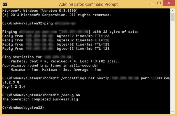 - bcdedit /dbgsettings neto hostip = puerto 192.166.0.123 = XXXXX key=z.z.z.z