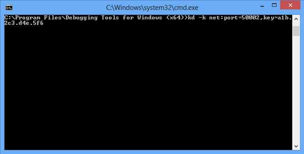 - Escriba el siguiente comando. KD - k net:port=XXXXX,key=z.z.z.z (donde XXXXX es el puerto que se establece en el equipo de destino y z.z.z.z es la clave que se establece en el equipo de destino)