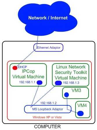 El objetivo de este proyecto es usar IpCop (distribución gratuita de Linux) en una máquina Virtual para proteger un sistema de host de Windows en cualquier red. IpCop es un Linux muy potente basada en Firewall con funciones avanzadas como: VPN, NAT, enrutamiento, detección de intrusos (Snort) y administración basada en Web. El concepto es que todo el tráfico en el host OS tendrán que viajar a través de la VM IpCop, protegiendo así el Host. El host de sistema de Windows no tendrá ninguna conectividad IP en su NIC física y será incapaces de comunicarse en la red sin la máquina virtual de ejecución. El anfitrión y la máquina virtual se comunicarán usando el adaptador de bucle invertido de Microsoft (instalado en el host). También podrá configurar otras VMs para utilizar fácilmente la VM IpCop como puerta de enlace a la red/internet.
