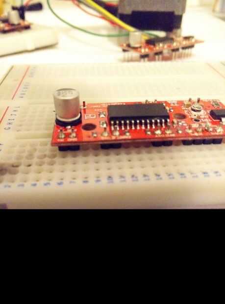 Voltee todo esto, así que ahora tienen el conductor tendido boca abajo y los largos extremos de los pasadores (y la plástica) apuntando hacia arriba y sean rectos todos los bolos. Presione suavemente un protoboard en esto y ahora todos los pernos deben ser pegados en el protoboard y el EasyDriver debe estar en la parte inferior. a su vez que esta cosa entera boca abajo otra vez así que ya que tienes las clavijas que se pega en la protoboard y la fácil bit controlador en la parte superior. Este bit se hizo para fijar los pernos en su lugar para facilitar las cosas mientras se suelda. Proceder a la soldadura de la parte del perno que sobresale de la parte superior del EasyDriver para el controlador de sí mismo, tomarse tiempo para asegurarse de que todos los empalmes de la soldadura se realizan correctamente.