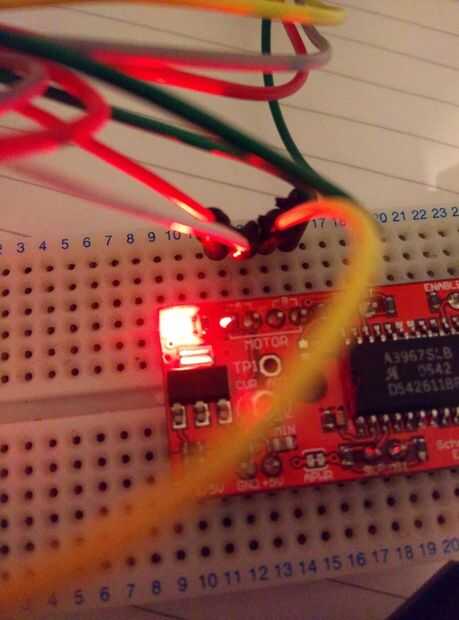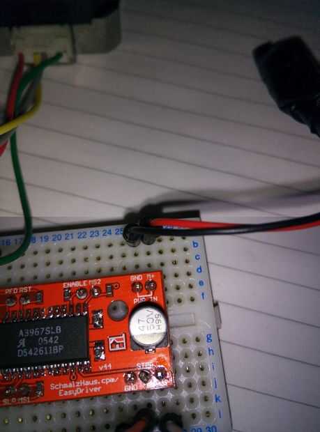 Compruebe que todos los cables están conectados correctamente y conectan la fuente de alimentación de arduino, a continuación, la fuente de 12V para el tablero de EasyDriver, y debe tener ascensor. Deberá encenderse una luz roja en el tablero y tu paso a paso debe empezar a girar