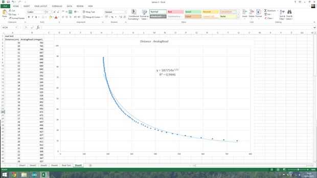 Poner los valores analogRead en el eje x y la distancia en el eje y. Lo he hecho así para que pueda utilizar la función de regresión más adelante en otro programa de Arduino.