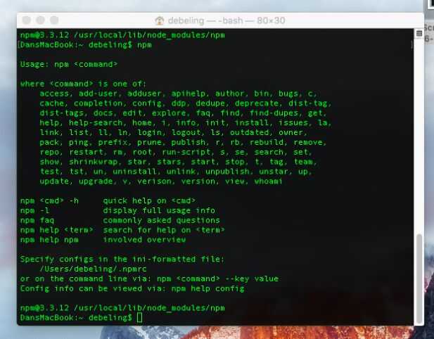 Esto nos confirma que nuestro paquete Gerente MPSP está trabajando y listo para ser utilizado. Lo que se imprime son algunos consejos útiles sobre cómo vamos a usar MNP para construir nuestro servidor de archivo estático. Si usted no se algo como esto y en cambio tiene un error de bash o algo parecido intente volver a instalar Node.js. Si eso no funciona, consulte a google con su error porque está fuera del alcance de este tutorial. Además, deja abierta la terminal. Vamos a usarlo más tarde.