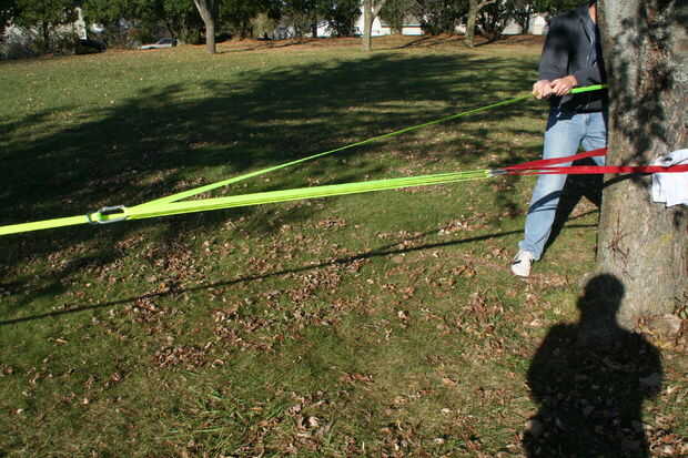 Para apretar la línea, tire de la cola mucho tiempo restante de la línea. La hermeticidad de la línea está totalmente hasta la preferencia personal. Generalmente, dos o tres personas se tirón de la línea a la vez para obtener tan apretados como sea necesario. Este paso siempre se puede repetir si la línea se convierte en demasiado floja durante el uso.