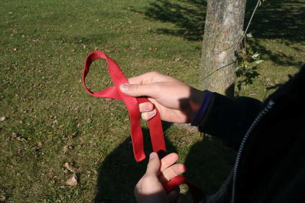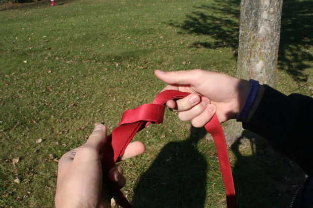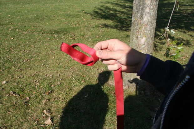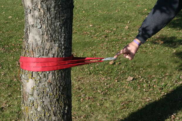 Ahora, utilizando uno de los ganchos de anclaje acaba de crear, ir alrededor del árbol una vez con él a una altura hasta la mitad del muslo. Luego, poner un mosquetón (mosquetón 1) a través de ella como se muestra en la foto. Permita que el combo de mosquetón/anclaje colgar del árbol por lo que se pueden completar los pasos siguientes.