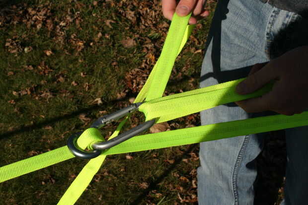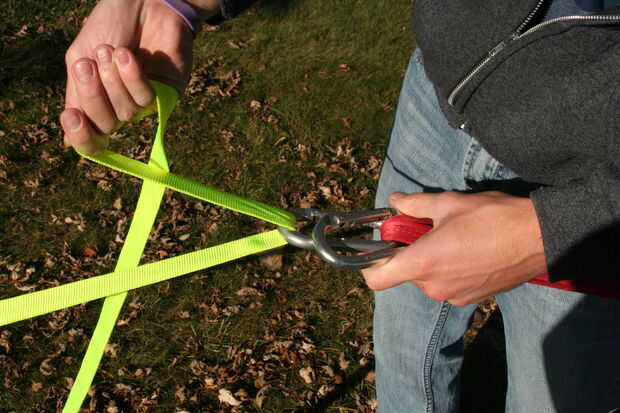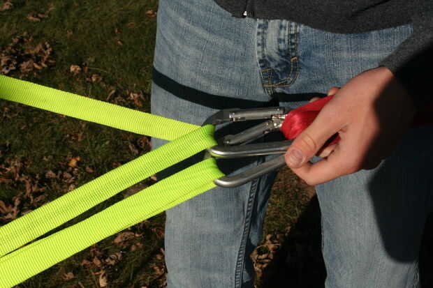 En primer lugar, asegúrese de que la línea no esté retorcida. Tomar la línea principal y subir por un mosquetón 3. Luego subir por un mosquetón 4. Desde aquí, desciende por un mosquetón 2. La línea debe ser ahora entre sí. Ir hacia abajo por un mosquetón 4 una última vez y deslícelo por debajo de la línea que ya estaba en mosquetón 4 como se muestra.