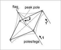 4. encontrar dos de los polos de la pierna. En uno de los lados del bastidor de marco, inserte cada una de las piernas en los codos de la esquina. Levantar este lado. Ahora encontrar el polo de pico. En el interior de la estructura de truss, en el medio centro donde lo cables cruzan, inserte este poste. Asegúrese de que esté completamente insertado para que haya una parte de él sobresale en el lado exterior de la carpa. En ese extremo de la varilla donde sobresale, es dónde poner la bandera.