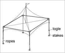 6. en cada codo hay cuatro cuerdas. Asegúrese de que cada una de las cuerdas se fija firmemente en las esquinas. Usar el Ajustador de anillo de tracción en las patas telescópicas ajustables, subir o bajar a la altura que usted prefiera. Con las cuerdas ahora seguro, conducir las estacas en el suelo por los cuatro costados. Usando la palanca, apriete las cuerdas asegurándose que estén firmes y tensas.