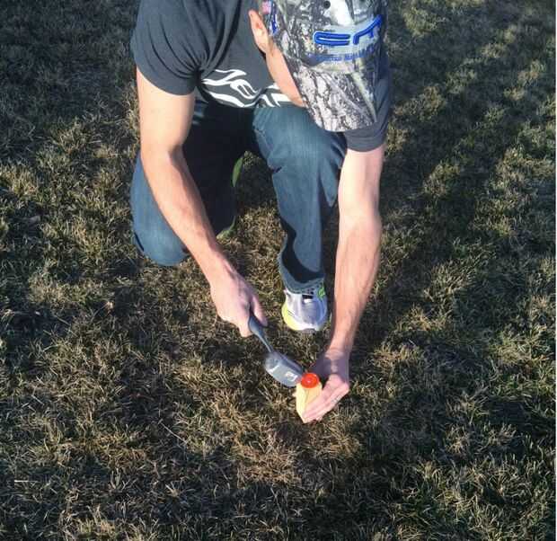Usando un clavo pequeño aprovechado en el centro de una estaca de madera, libra de la hoguera y tan al ras como sea posible, con el suelo.