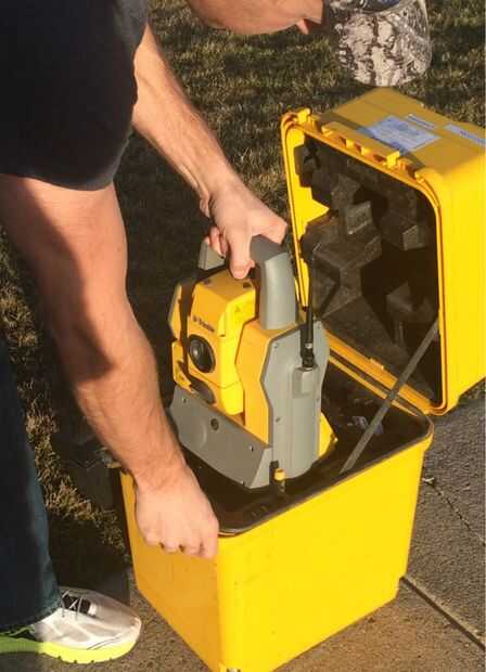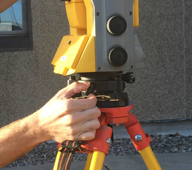 Saque la estación Total de la caja de transporte y asegúrelo a la parte superior de la base nivelante con la cerradura de la base nivelante instrumentos.