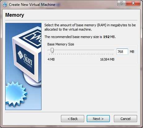 -Ahora usted puede especificar la cantidad de RAM que desea asignar a la máquina virtual. Cuánta RAM debe asignar depende de 2 factores: primero, que sistema operativo desea ejecutar en la máquina virtual, y en segundo lugar, cuanto RAM tienes (a saber, compruebe las propiedades de mi PC). Una distro de Linux, 512MB debe ser cómodo. Para algo como Vista o Windows 7, ni más ni menos entonces 1GB lo (se recomienda 2GB). Tenga en cuenta que no debería asignar más 50% del RAM total de la VM o existe la posibilidad de que la VM puede congelar mientras se está ejecutando debido a la memoria del host baja. Personalmente tengo 2GB de RAM así que asignaron 768MB a mi instalación XP.
