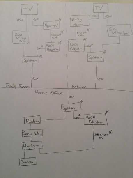 El dibujo adjunto muestra mis intenciones para una instalación de tres habitaciones. La primera habitación para empezar es donde usted encontrar tanto un Ethernet y coax drop en el hogar, que está en la oficina para este proyecto. He estrellado (*) donde estoy agregando equipos o cables que no existía previamente.