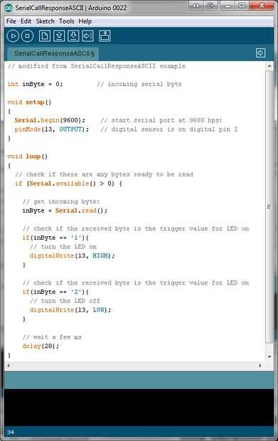 Una cosa importante es que tiene que haber una conexión en serie que el software en el PC para enviar comandos de acción para el Arduino mediante el cable USB. Por esta razón ofrecemos un script con lo básico en ella. Se escucha el puerto serie y se encenderá un LED cuando recibe un '1', y apagará cuando recibe un '2'.