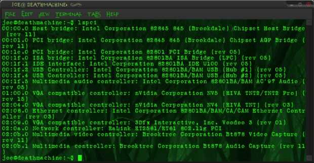 ya usted debería mirar en tu escritorio de linux en una sola pantalla aburrida. abrimos una terminal y tecleamos lspci ahora debería ver una lista de dispositivos y su id de bus. encontrar las tarjetas gráficas y escriba el id de bus que usted los necesitará más adelante.