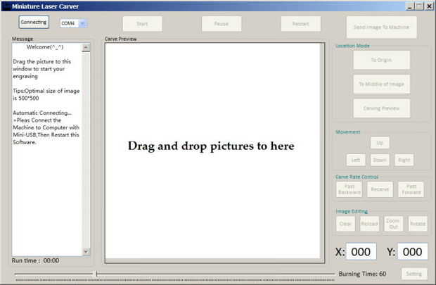 El software grabador de láser para NEJE DK-5 Pro-5 no necesita una instalación, se puede ejecutar desde la tarjeta SD. Doble clic en el archivo "2015.11.10.3.0.0.exe Carve_EN láser" debe ejecutar el software, la imagen de abajo muestra la pantalla principal del software.