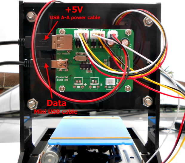 El adaptador de corriente 5V 1A está conectado al grabador láser mediante un cable USB de A, y el puerto de datos del grabador del laser está conectado al puerto USB de la computadora mediante un cable Mini USB.