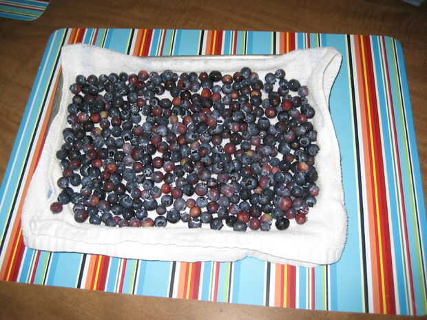 Luego secarlas y disponer en una sola capa sobre una bandeja para hornear que quepa en tu congelador (aviso mío es muy pequeño). Sugiero colocar una toalla de plato limpio y seco en la parte inferior de la bandeja por lo que las bayas no se pegan a él.